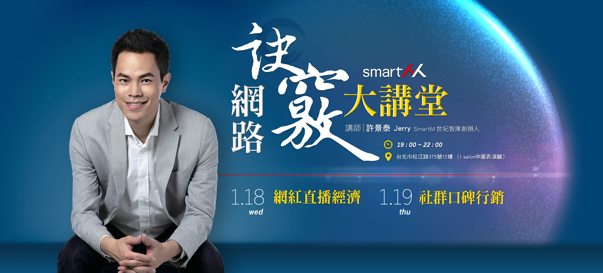【SmartM 網路訣竅大講堂】本系列課程,邀請到資深網路媒體行銷專家許景泰(Jerry),要你快速掌握 「網紅」發展趨勢、獨家解析百大網紅竄紅秘訣;從直播軟體操作、建立口碑行銷策略乃至於社群經營,精準打中目標客群、掌握高強度商品轉換率的成功關鍵!