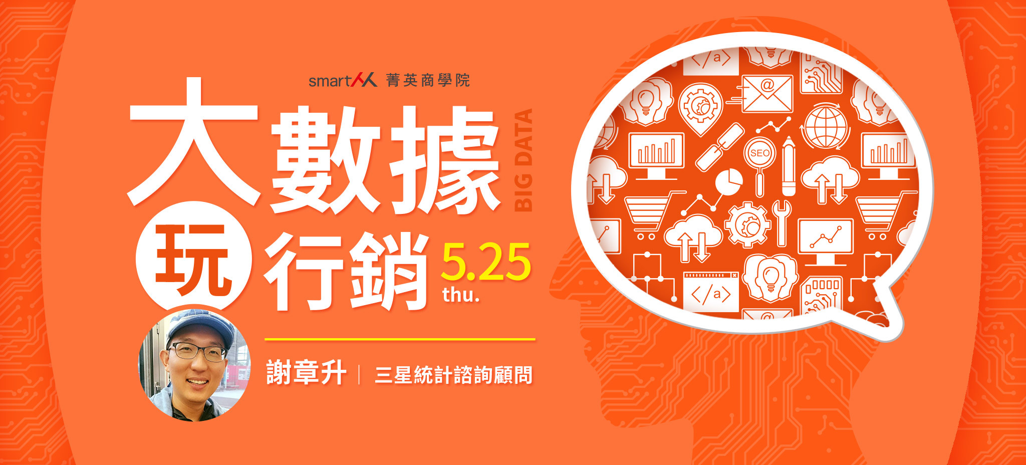 大數據不只是資料處理工具,更是一種企業思維和商業模式,而資料量的大小只是大數據的其中一個面向,大數據揭示的是一種「資料經濟」的精神,從這些資料中提煉價值、奠定數位行銷的穩固根基!熟稔兩岸三地網路行銷與流量分析、擁有8年以上實戰資歷的三星統計諮詢顧問謝章升,將於SmartM本次課程帶你達成以下目標: