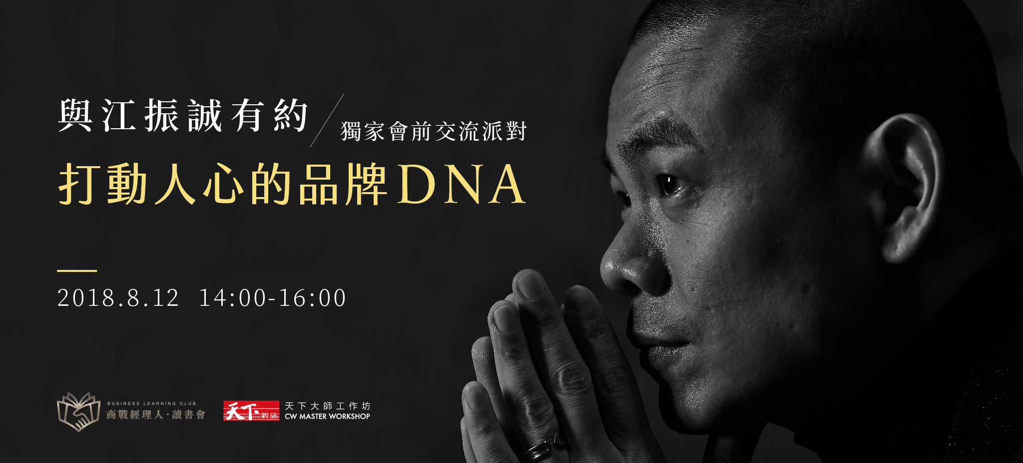 8/12獨家會前交流派對【與江振誠有約-建立打動人心的品牌DNA】8/12特別邀請江振誠舉辦獨家會前交流派對,會員獨享活動,最近距離的私密小聚,限額限時僅此一場,就此一回,錯過不再!每一個成功的細節,...